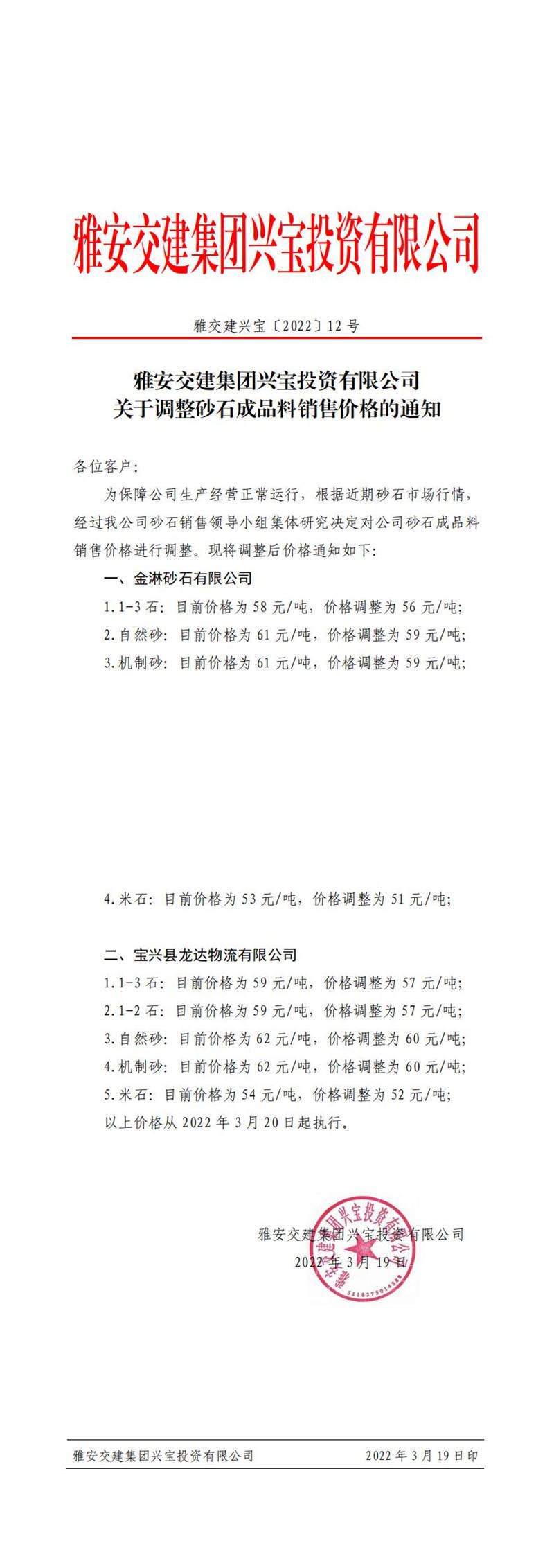 雅交建興寶〔2022〕12號 關于調整砂石成品料銷售價格的通知3月19日