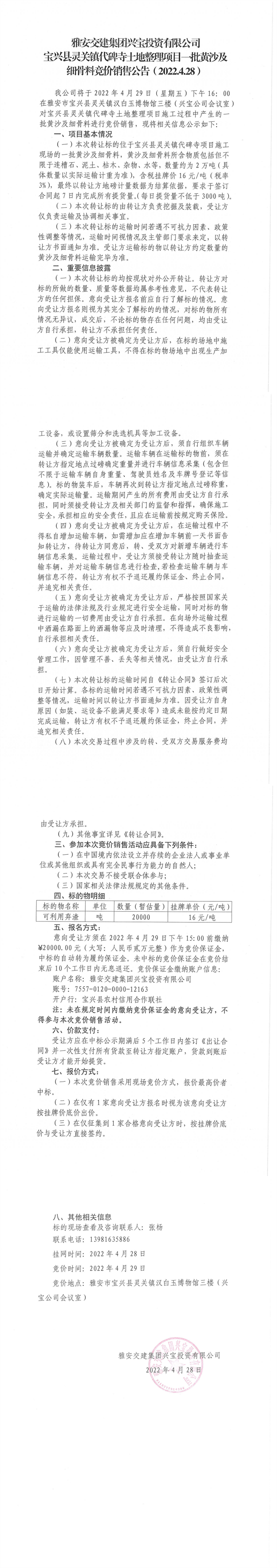 雅安交建集團興寶投資有限公司寶興縣靈關(guān)鎮(zhèn)代碑寺土地整理項目一批黃沙及細骨料競價銷售公告(2022.4.28)