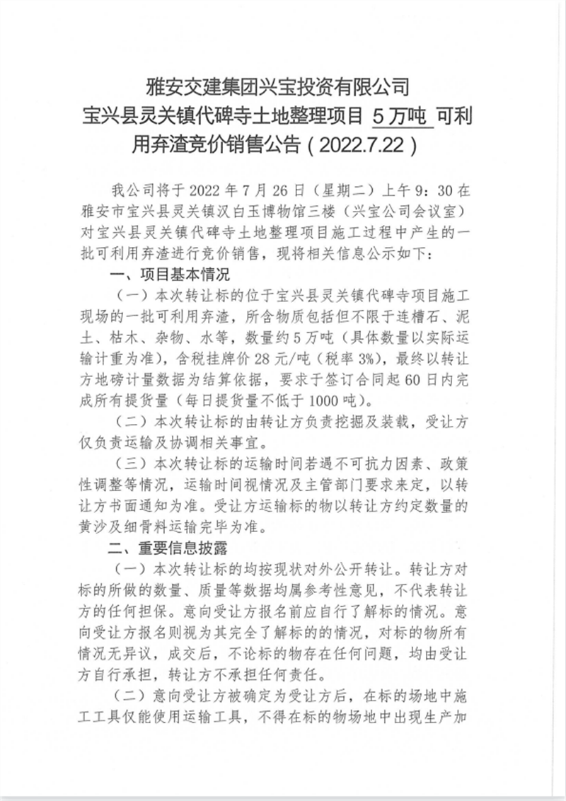 興寶公司寶興縣靈關(guān)鎮(zhèn)代碑寺土地整理項(xiàng)目10萬噸可利用棄渣競價銷售掛網(wǎng)公告7.22(10萬噸)