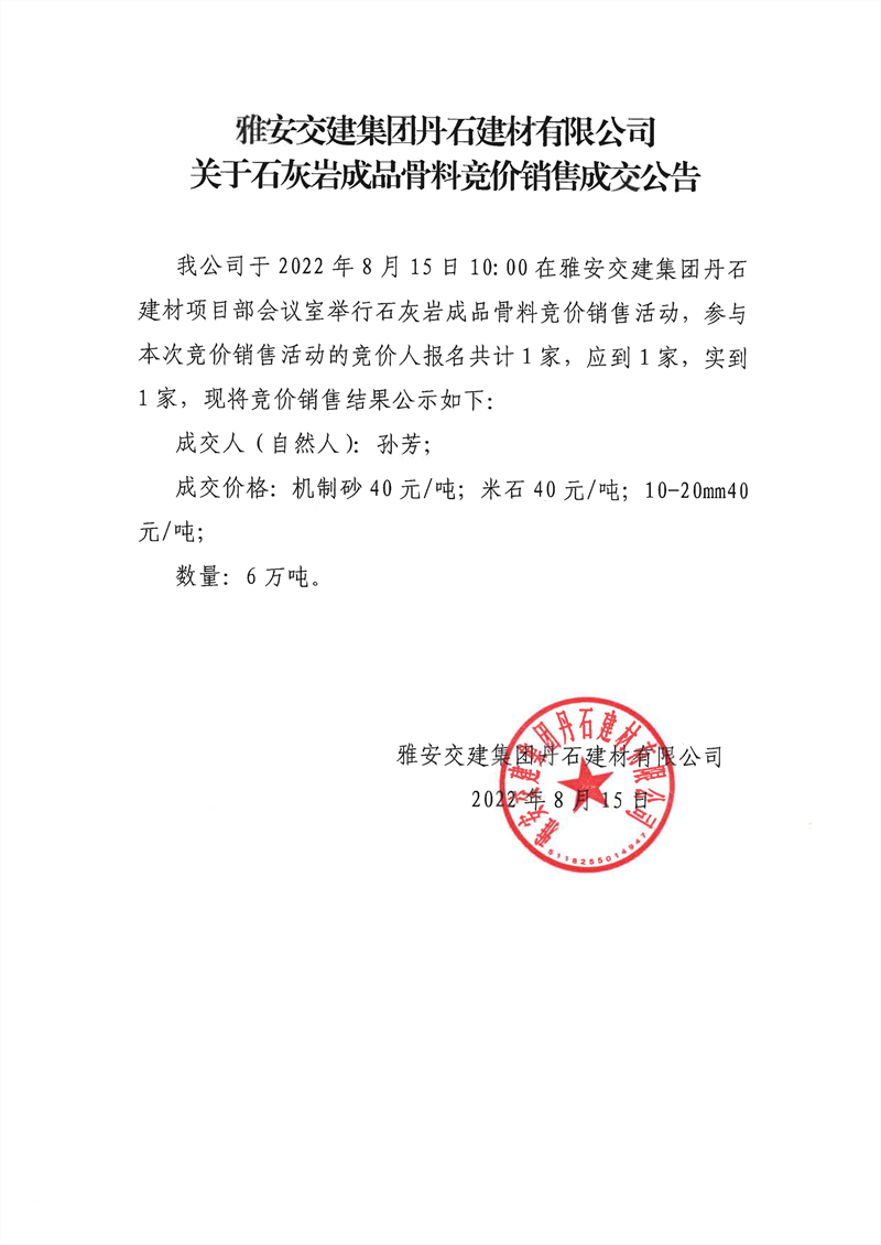 雅安交建集團丹石建材有限公司關于石灰?guī)r成品骨料競價銷售成交公告