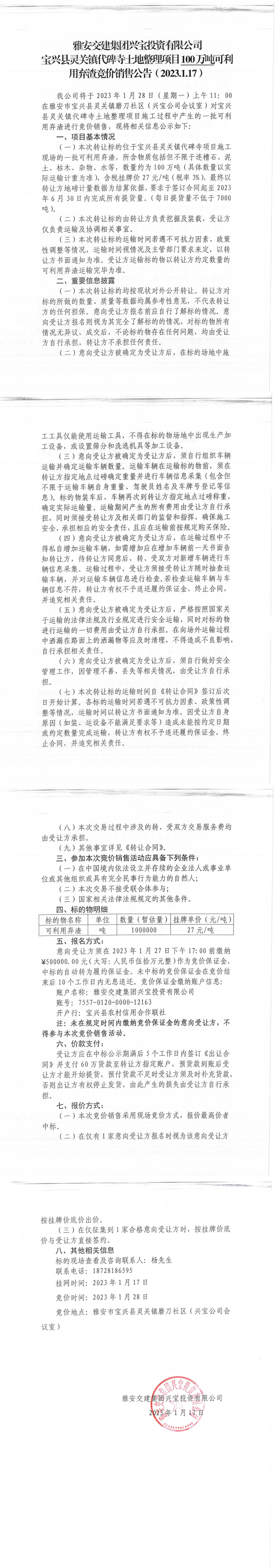雅安交建集團(tuán)興寶投資有限公司100萬(wàn)噸可利用棄渣競(jìng)價(jià)銷售流標(biāo)公告(2023.1.16)