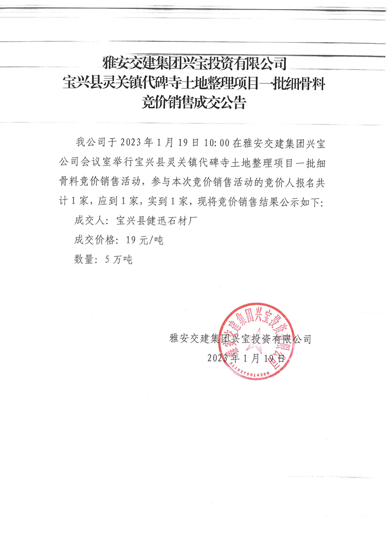 雅安交建集團(tuán)興寶投資有限公司代碑寺土地整理項目細(xì)骨料競價銷售成交公告(2023.1.19)
