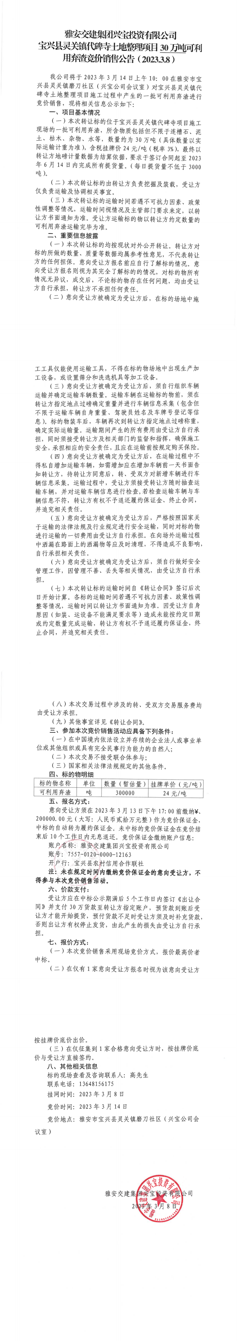 雅安交建集團(tuán)興寶投資有限公司靈關(guān)鎮(zhèn)代碑寺土地整理項(xiàng)目30萬噸可利用棄渣競(jìng)價(jià)銷售公告(2023.3.8)