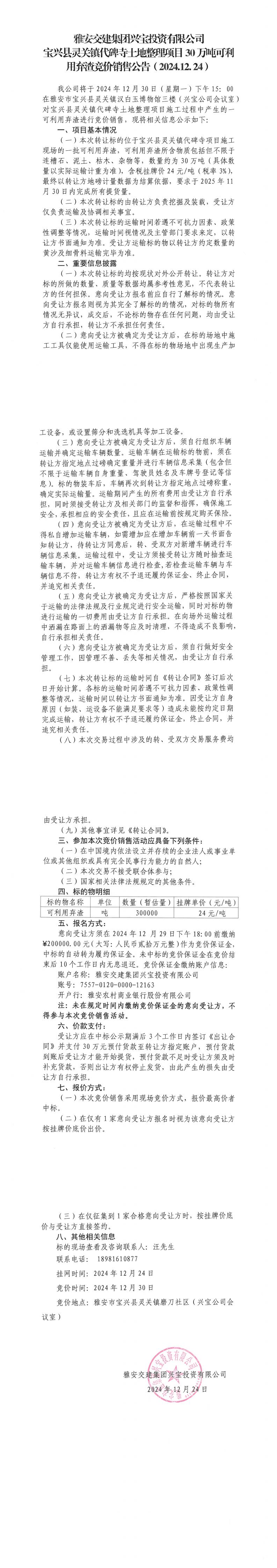 雅安交建集團(tuán)興寶投資有限公司靈關(guān)鎮(zhèn)代碑寺土地整理項目30萬噸可利用棄渣競價銷售公告(2024.12.24)